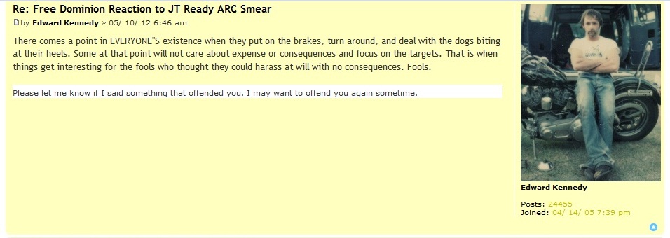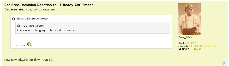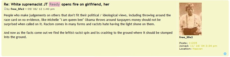 It didn't take too long for one of our most faithful readers to report back to our friends at Free Dominion regarding our post on their reaction to the JT Ready murders/suicide here: