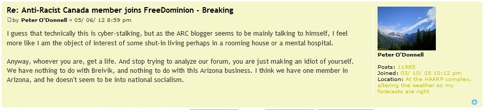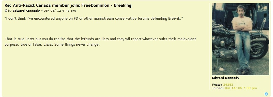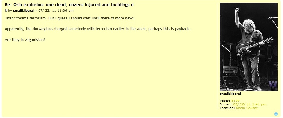 Now when we posted the article in question, it wasn't intended to claim that the folks on Free Dominion agreed with or justified Breivik's actions (though, again, we invite our readers to examine Ed Kennedy's posts in the years and months prior to when the tragedy took place) but to comment on their tendency to jump to conclusions that fit their ideological bent. Certainly we're all capable of doing this and that reality doesn't know political ideology, however Free Dominion members have a tendency to pat themselves on the back about how they would never do that themselves. Some of our friends made that point clear much earlier than we did (see here and here).