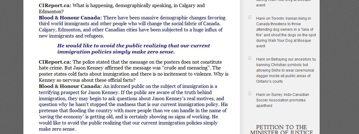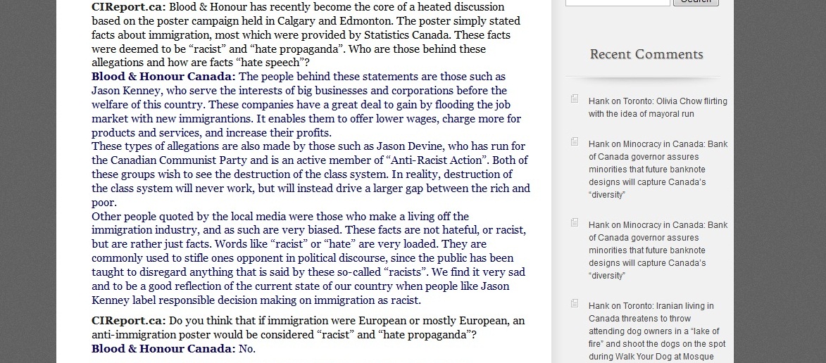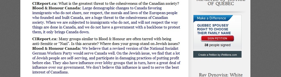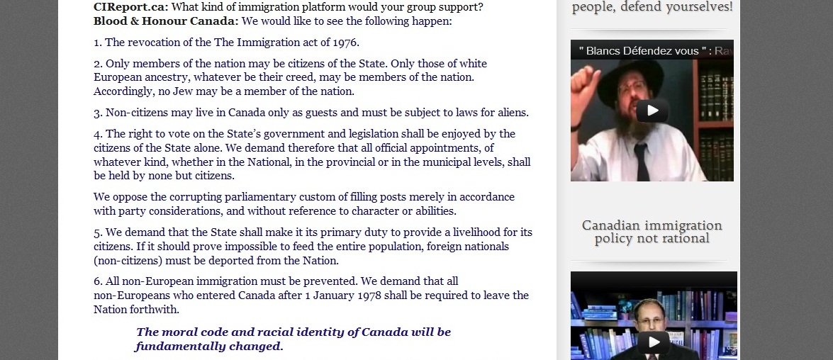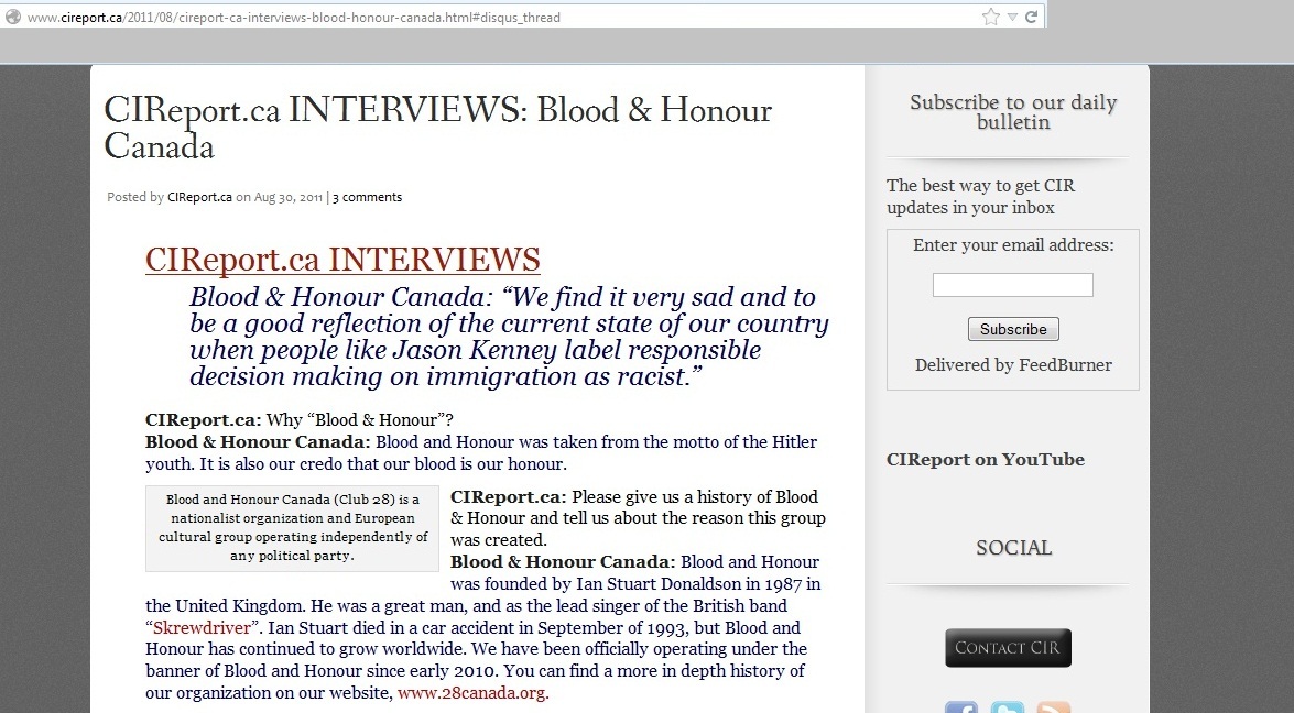 We had come across the CIR some time ago but we started significant attention once they interviewed Kyle McKee who was speaking for Blood & Honour in Calgary (we'll post the screen shots of the interview on the CIR website at the bottom of the page). The agenda of the CIR is clear as day if one simply spends three minutes examining the website, however our concern is that they have attempted to surreptitiously influence the education system of Quebec in a small way.