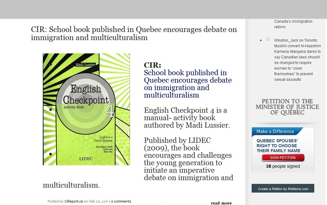 Madi Lussier also promotes the book, which she describes as a, "school book published in Quebec [that] encourages debate on immigration and multiculturalism" on the CIR website: