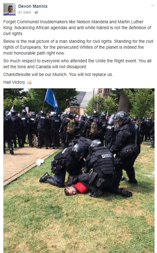 The racist rally was also being followed by many of those ARC has covered here on the blog, including Devon Mannix (formerly of the CAP) who celebrated the events of yesterday evening and today, alluding to the rise of Hitler: