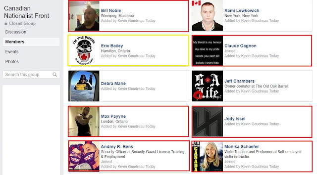 In the meantime, Myatt is also a member of Goudreau's Canadian National Front's (formerly White National Front) Facebook group. While he may very well be there simply because he was added Goudreau and does not know much about the other members, he is currently keeping some interesting and somewhat notorious company while he remains in the group (red are known racists and people who are members of racist groups; those highlighted in yellow are parts of groups that are leaning in that direction as well or individuals who are on the cusp):