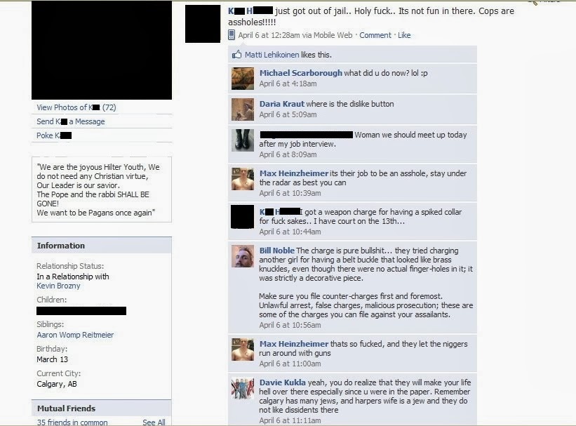 Interestingly, it looks like another bonehead may also be out of jail, or he's given someone else access to his Facebook account. In discussing the "White Pride" march that had been planned for next month (though we had doubts whether they would be able to pull it off given the current troubles of both the Aryan Guard and W.E.B.), John Marleau, or someone on Marleau's Facebook account, posted the following brief message:
