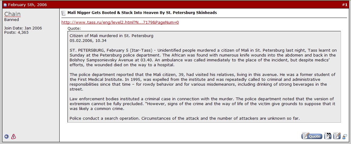 Well, there's a very easy way for our readers to determine the truth of Billy's claim here. While we will not provide the link to the site, we would invite our readers to type, "podblanc" into Google. There, you will find such charming videos as, "Skinhead beatings (best of)" which is a compilation of neo-Nazis attacking and beating minorities (you will also notice that these are often from behind and involve multiple neo-Nazis against a single, often much smaller, individual). You'll also find the video of Russian neo-Nazis who have kidnapped two people who appear to be from the Caucuses, cut off their heads and state that this is a warning of what will happen to other, "non-Russians" living in Russia. We managed to find videos supporting the mass murder of Jews. Of Muslims. Of homosexuals. And this is a site that was created and maintained by our friend, Craig Cobb.