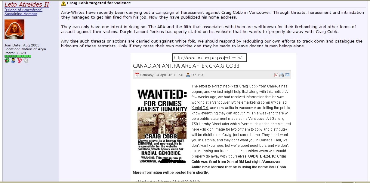 under the post regarding Craig Cobb concerning his firing from Xentel. We didn't allow the comment to pass moderation and hadn't initially intended to publish it, however given the recent posts by Bill Noble on Stormfront regarding the Cobb protests, we figured that it would serve as an interesting and telling counterpoint to the claims now being made by Bill Noble: